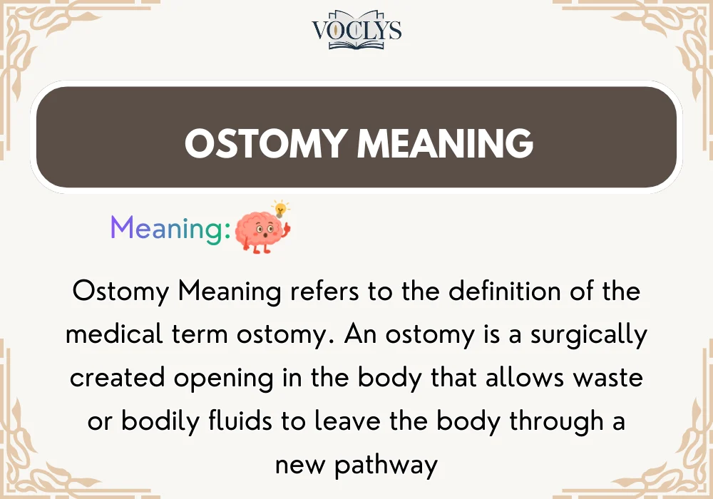 Ostomy Meaning refers to the definition of the medical term ostomy. An ostomy is a surgically created opening in the body that allows waste or bodily fluids to leave the body through a new pathway.
